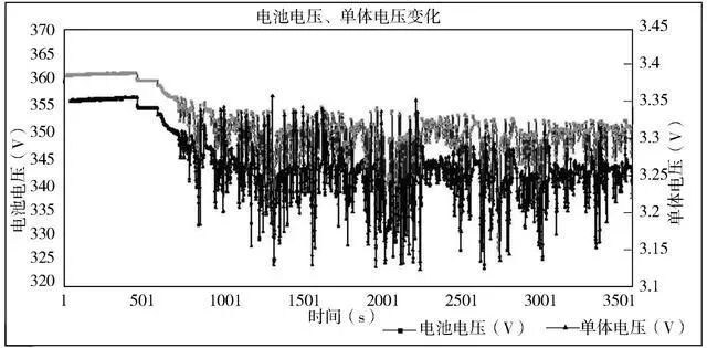 因此,必须对单体电池进行监控,以确定其充放电状态,保证电池组安全有效的运行。本试验根据试验车行车过程中采集的工作电压以及单体电压的数据,考察不同工况对锂离子动力电池单体电压和工作电压的影响。 图5-7分别是试验得到的长距离工况、市区山坡工况以及高峰期堵车工况下工作电压与单体电压的变化曲线。