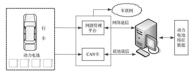 锂离子动力电池运行的特征数据的采集,不仅可以通过试验室中对锂离子动力电池进行性能测试,还可以采用CAN卡总线以及管理平台联网监控与采集行车与电池工况的数据,采集示意图如图1。