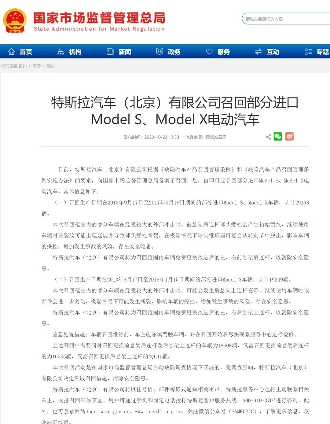 根据特斯拉汽车(北京)有限公司向国家市场监督管理总局备案的召回计划,将自即日起召回部分进口Model S、Model X电动汽车。召回文件显示,本次召回活动是在国家市场监督管理总局启动缺陷调查情况下开展的。受调查影响,特斯拉汽车(北京)有限公司决定采取召回措施,消除安全隐患,共涉及车辆29834辆。