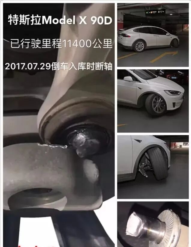 2017年7月,深圳魏女士驾驶买了仅4个月的特斯拉Model X,在车库倒车时,没有任何碰撞情况下出现车辆“脱轴”,右前轮连杆球头螺栓断裂脱出。