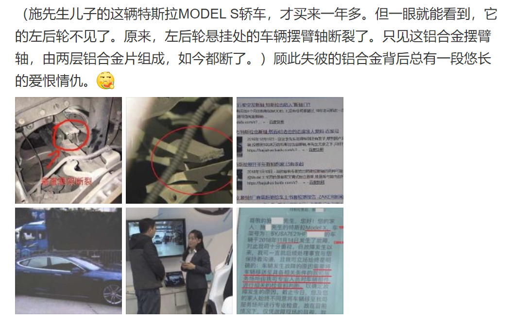 2018年12月,上海施先生的特斯拉Model S轿车,在车库正常行驶下,左后轮摆臂突然断裂,导致车辆无法行驶。